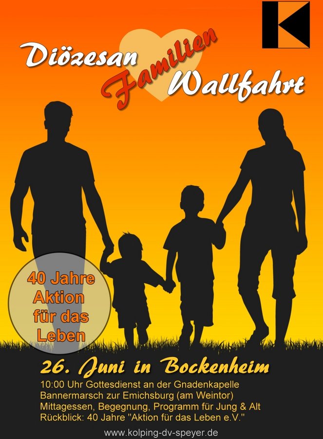 Kaiserslautern. Das Kolpingwerk Diözesanverband Speyer lädt alle Mitglieder und Freunde der Kolpingsfamilien und des Vereins "Aktion für das Leben e.V." ein zur Diözesanfamilienwallfahrt nach Bockenheim am Sonntag, 26. Juni. Beginn ist um 10 Uhr, das Ende für 15 Uhr geplant. Der Leitgedanke des Tages, zu dem besonders die (jungen) Familien eingeladen sind, ist - dem Heiligen Jahr folgend - "Barmherzigkeit".