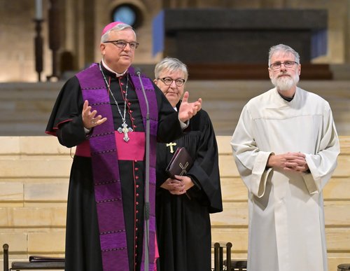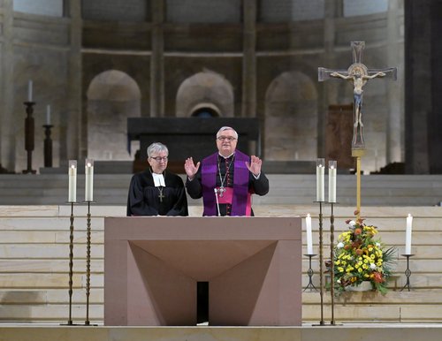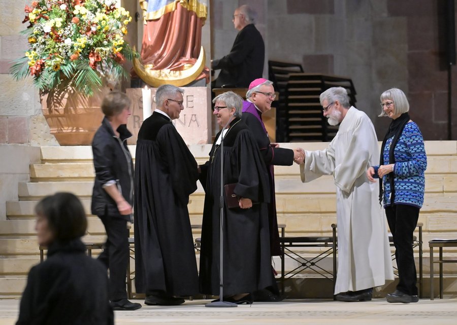 Speyer. Deutschlandweit fanden am Montag ökumenische Friedensgebete statt, um an den Jahrestag des terroristischen Überfalls der Hamas auf Israel und den daraus resultierenden Krieg zu erinnern, und um für ein Ende des Krieges und der Gewalt zu beten. In Speyer hatten Bischof Dr. Karl-Heinz Wiesemann (Bistum Speyer) und Kirchenpräsidentin Dorothee Wüst (Evangelische Kirche der Pfalz) gemeinsam in den Dom geladen. Zusammen mit Pfarrer Eicher, Gemeindereferent Bernhard Werner und Ehrenamtlichen feierten sie einen Wortgottesdienst. Das Ökumenische Friedensgebet setzte ein Zeichen der Solidarität mit allen Menschen, die leiden und auf Frieden und Versöhnung hoffen.