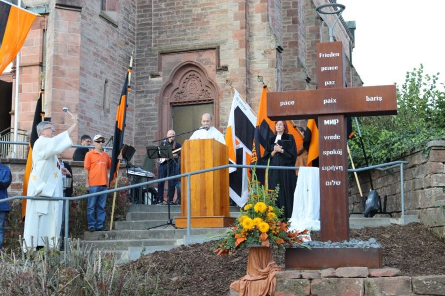 Unter den Ehrengästen befanden sich Brigitte Mannert, die Präsidentin der Handwerkskammer der Pfalz, und Dr. Till Mischler, der Hauptgeschäftsführer der Kammer. Beide haben das Projekt tatkräftig unterstützt. Bürgermeister Ganz freute sich über das Kreuz, mitten in seiner Gemeinde. Wolfgang Breitwieser, Mitglied im Vorstand der Handwerkskammer und selbst Vorsitzender einer Kolpingsfamilie, informierte über die Herstellung und die Errichtung des Kreuzes. Mit seiner Band Sacro Pep umrahmte er die Feier musikalisch. Worte des Dankes an alle Mitwirkenden im Gottesdienst sowie an Helfer und Unterstützer des Kreuzes sprach Harald Reisel, Stellv. Vorsitzender des Kolpingwerkes und Vorsitzender der Kolpingsfamilie Dahn. Er brachte den Wunsch zum Ausdruck, dass in Münchweiler in naher Zukunft wieder eine Kolpingsfamilie gegründet werde. Symbol dafür sei das alte Banner der Kolpingsfamilie Münchweiler, das heute aus Anlass des Friedenskreuzes zurückgekehrt sei.