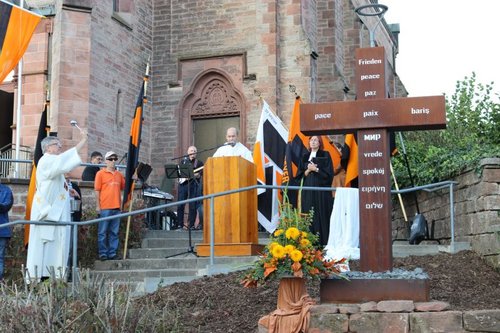 In einer ökumenischen Andacht vor der Kirche, direkt am neuerrichteten Friedenskreuz, wurde unter Leitung von Pfarrer Michael Stabel und Pfarrerin Susanne Dietrich in Wort und Gebet auf die Bedeutung des Friedenskreuzes hingewiesen. Am Kreuz Christi zerbreche jegliche Gewalt und von Ostern her entfal-te sich unumkehrbar der Frieden unter den Menschen. Pfarrer Stabel segnete das Kreuz, Diakon Andreas W. Stellmann, Diözesanvorsitzender des Kolpingwerkes, besprengte es mit Weihwasser.