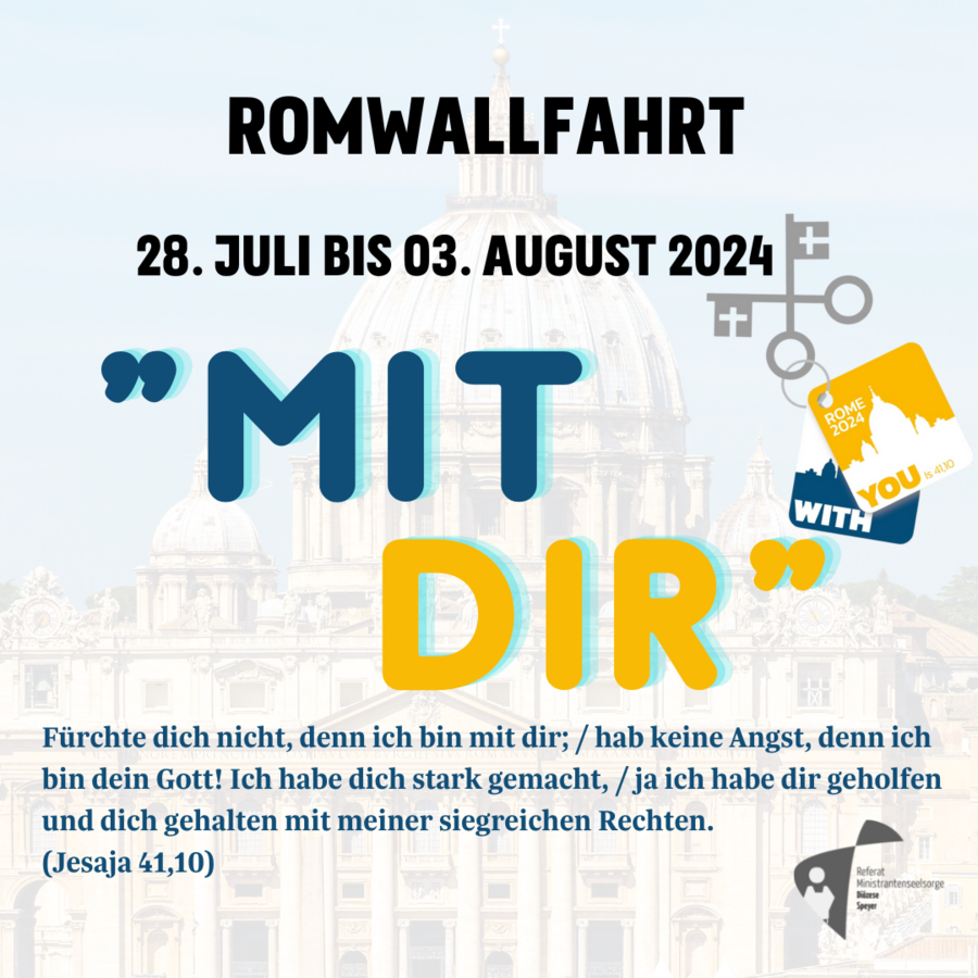 Auch aus dem Bistum Speyer können wieder Messdienerinnen und Messdiener, die am 28. Juli 2024 mindestens 13 Jahre alt sind oder im Schuljahr 2023/24 die 7. Klasse besuchen, an der Wallfahrt teilnehmen. Das Motto der Wallfahrt vom 28. Juli bis 3. August 2024 lautet: „Mit dir (Jesaja 41,10)“.
