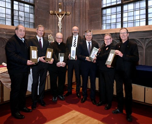 v.l.n.r.: Vertreter des Ordens der Ritter vom Heiligen Grab, Winfried Szkutnik, Dr. Benedikt Raether, Dr. Joachim Reger, Dr. Christian Pohl, Prof. Dr. Christopher Wolf, mit Domsakristan Markus Belz und Domdekan und Domkustos Dr. Christoph Kohl bei der Übergabe des Olivenöls in der Sakristei des Doms © Domkapitel Speyer, Klaus Landry