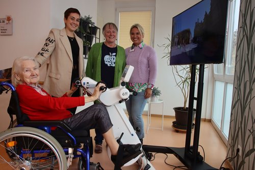 Die Seniorin radelt nicht wirklich durch Bayern, sondern sitzt in ihrem Rollstuhl im ersten Stock des Caritas Altenzentrums St. Elisabeth. Ihre Füße stehen auf den Pedalen des MOTOmed Bewegungstrainers, eine Art Fahrrad-Ergometer. „Ich trete auch nicht selber, ich werde getreten“, verrät die Seniorin lachend. Das MOTOmed gibt es schon länger im Altenzentrum. Bewohner können im Rollstuhl oder einem Sessel davor sitzen, aktiv treten oder die Beine passiv bewegen lassen. Jede und jeder so, wie es möglich ist. Das Gerät ließe sich auch auf Handbetrieb umschalten.