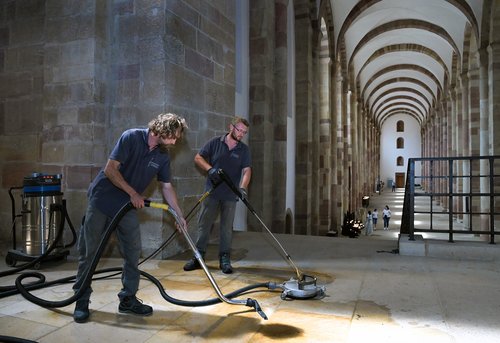 Bodenreinigung im Speyerer Dom bedeutet, dass 2500 Quadratmeter Bodenfläche in Angriff genommen werden. Das ist zweimal die Fläche eines olympischen Schwimmbeckens. Begonnen wurde im Osten, im Bereich der Apsis. Von dort aus folgen die Vierung, die Querhausarme, der Chorraum bis zur Ebene des Pfarraltars und schließlich das Mittelschiff und die Seitenschiffe. Im Querhaus und dem Mittelschiff müssen dazu die Bänke verschoben werden, was bei einem Gewicht von jeweils über 100kg eine sportliche Aufgabe ist, die mittels eines besonderen Wagens gelöst wird. Bis zum Beginn der Adventszeit sollen die Reinigungsmaßnahmen abgeschlossen sein.