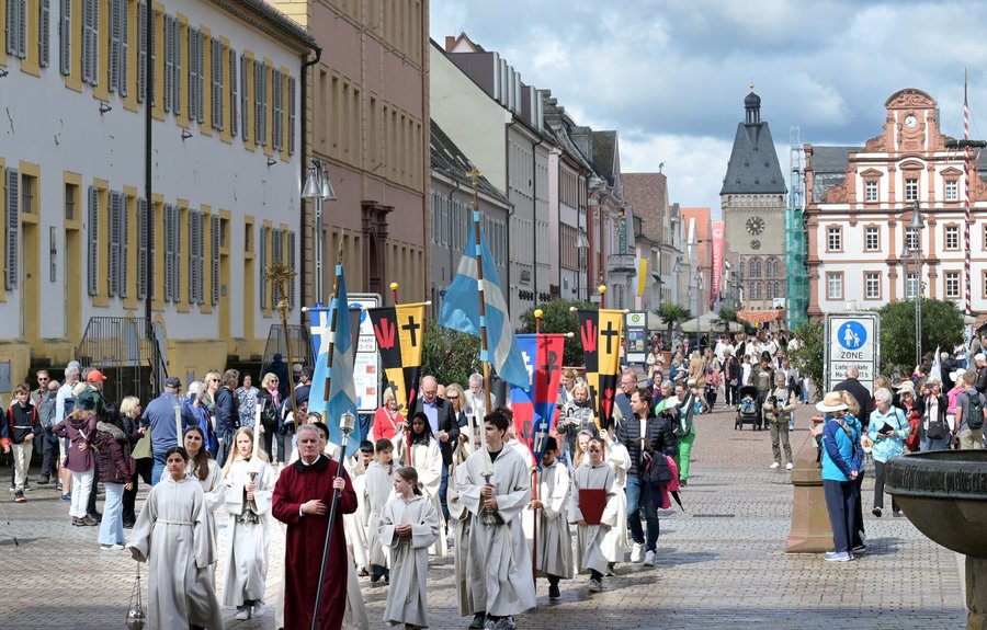Speyer. Am 30. Mai 2024 feierten die Speyerer Katholikinnen und Katholiken gemeinsam Fronleichnam, das Hochfest des Leibes und Blutes Christi. Zu Beginn zelebrierte Bischof Dr. Karl-Heinz Wiesemann ein Pontifikalamt in der Kirche St. Joseph, dem eine Prozession durch die Stadt zum Dom folgte.