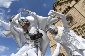 Die rund dreißigköpfige Künstlergruppe um die Dozentin und Theaterwissenschaftlerin Èva Adorján zogen zu Beginn von der Alten Münz‘ zum Dom und sangen „heute lesen wir für den Dom“. Dominierende Blickfänger waren dabei die beiden über fünf Meter großen Stelzenläufer „Anemon & Lotus“ mit ihren selbstgeschneiderten Kostümen mit luftgefüllten Tentakeln, Geschöpfe, wie aus einer anderen Welt. Mit majestätischer Eleganz verwandelten sie die Innenstadt, in der auch mehrere Leseinseln mit Sofas und Hockern zum Schmökern einluden, in eine poetische Traumlandschaft.