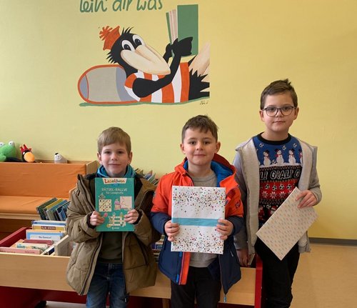 Büchereimitarbeiterin Katrin Seichter erzählt: „Bei der Verlosung am Dienstag, 16.01.2024, gewannen einen Buchpreis: Klasse 1a - Runar Dreisbach (nicht auf dem Foto), Klasse 1b - Ben Stadel, Klasse 2 - Frederik Wetzka, Klasse 3a - Moritz Kretschmar (nicht auf dem Foto), Klasse 3b - Amar Zatoviq, Klasse 4 - Liv Emilie Meier (nicht auf dem Foto).“