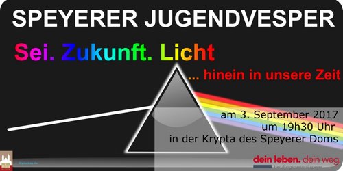 Speyer. Unter dem Thema "SEI. ZUKUNFT. LICHT …hinein in unsere Zeit" findet am Sonntag, 3. September, die nächste Speyerer Jugendvesper in der Krypta des Domes statt. Dazu lädt Pfarrer Ralf Feix von der Stabsstelle Berufungspastoral alle Interessierten ein.