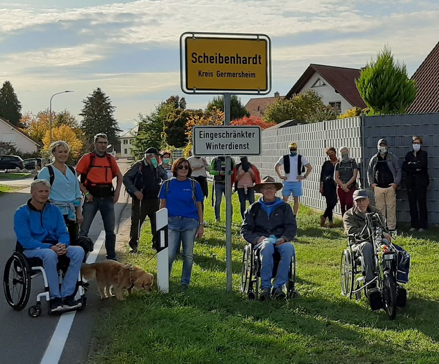 Scheibenhardt. „Pilgern für alle“ - so hieß die Jakobspilger-Tour, die im September in Worms gestartet wurde. Wegen schlechten Wetters musste sie unterbrochen werden. Mit den zwei letzten Etappen von Herxheim nach Kandel und von Kandel nach Scheibenhardt ist sie vorerst beendet. „Aus Corona-Gründen konnten die Teilnehmerinnen und Teilnehmer nicht zum eigentlichen Zielort nach Lauterburg in Frankreich pilgern. Das wird aber nächstes Jahr nachgeholt“, meinte Mitsch Schreiner, der die Tour organisiert hat und alle Abschnitte mit dem Rollstuhl gefahren ist. Begleitet wurde er von Ursula Roser und dem Hund Leni. Immer wieder waren andere „fahrende und laufende“ Wanderer dabei. Vor der Kirche in Scheibenhardt bedankte sich Simone Jennewein vom Hospiz in Pirmasens. Über 2000 Euro wurden für den Neubau des Hospizes gesammelt.