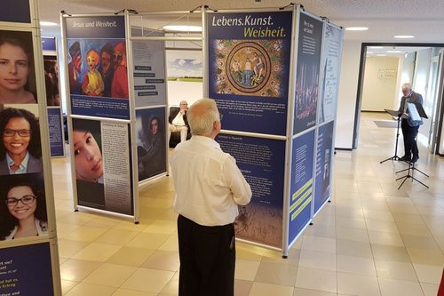 Neustadt. Seit Sonntag, 29. Septemember, ist im Kloster Neustadt die Ausstellung „Lebens.Kunst.Weisheit“ zu sehen. Sie besteht aus sieben Säulen mit großformatigen Bildern und Fotos und einem „Portal“, das gewissermaßen den Eingang markiert, den Besucher begrüßt und eine allgemeine Einführung gibt. Durch dieses Portal verlässt man die Ausstellung auch wieder und schaut zurück auf Jesus als Weisheitslehrer.