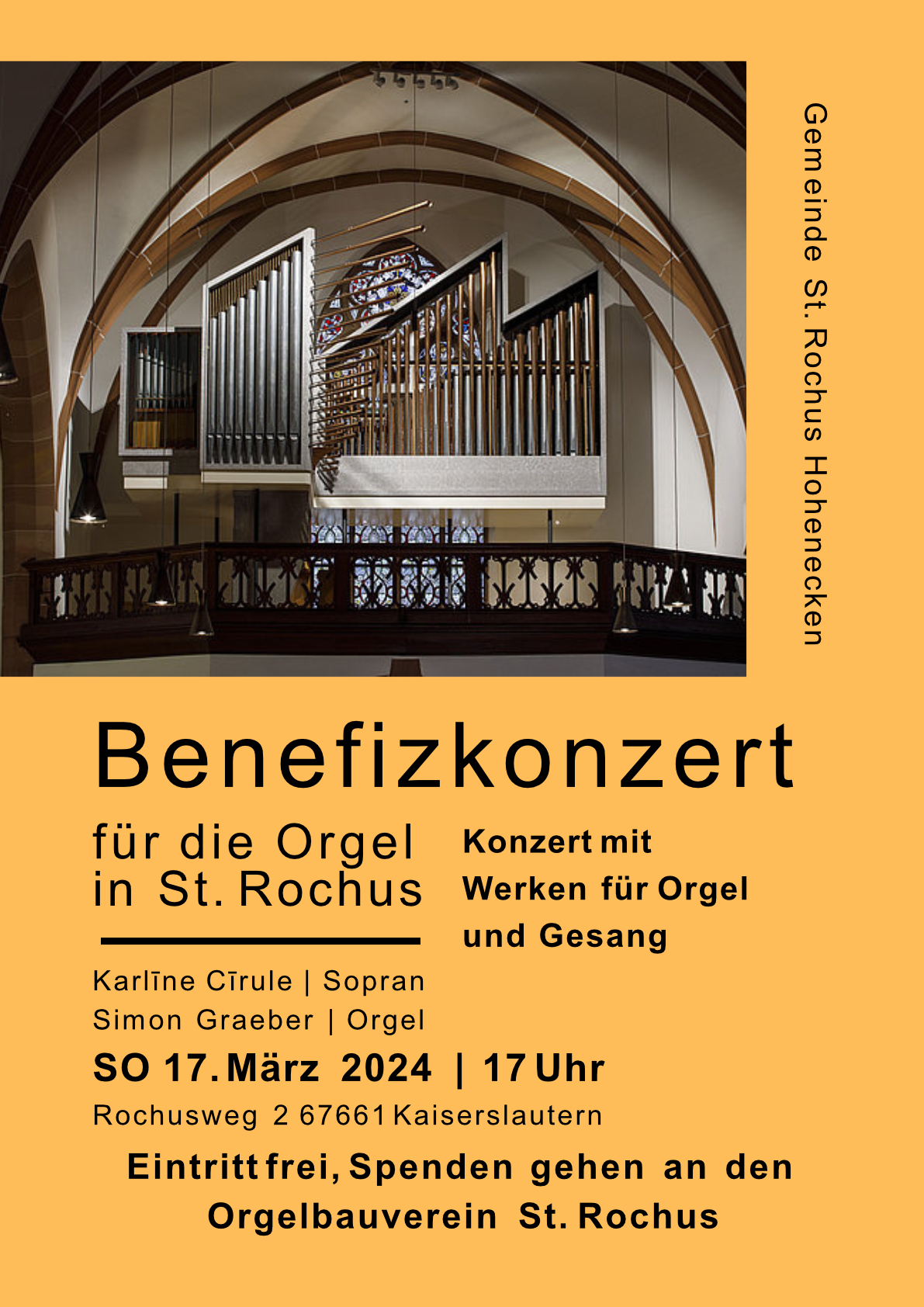 Kaiserslautern. Am Sonntag, 17. März 2024, um 17 Uhr lädt der Orgelförderverein der Rochuskirche Hohenecken zum Benefizkonzert in die Kirche St. Rochus Kaiserslautern Hohenecken ein.