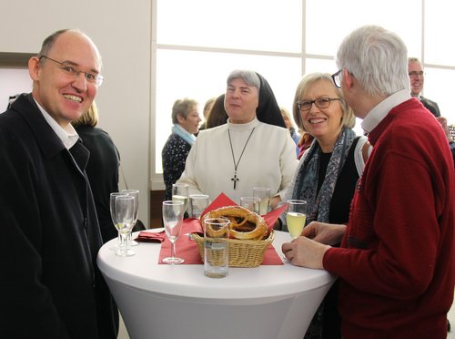 Beim anschließenden Neujahrsempfang im Haus der Kirchenmusik warf Generalvikar Andreas Sturm einen Blick auf wichtige Ereignisse im neuen Jahr. Am 15. September stehe wieder ein Katholikentag an, mit neuem Konzept in Kaiserslautern. Auch die Pfarrgremienwahl im November werde für das Bistum entscheidende Bedeutung haben. Einen Schwerpunkt setzte er beim Thema Missbrauch. „Nachdem wir uns in den letzten Wochen des vergangenen Jahres um die juristische Aufarbeitung der Taten gekümmert haben, wird Bischof Wiesemann in den kommenden Wochen Betroffene anschreiben und sie zum persönlichen Gespräch einladen“, kündigte er an. Mit diesem Schritt wolle das Bistum Betroffenen eine Stimme geben, „auf sie und ihr Leid hören und gleichzeitig mit ihrer Hilfe lernen, wie wir Kinder und Jugendliche noch besser schützen können“. Das Bistum sei auf einem guten Weg, aber noch nicht am Ziel. Gemeinsam mit Bischof Wiesemann werde er sich dafür einsetzen, „dass Täter bei uns nicht gedeckt werden, sondern dass wir Opfern helfen und alles dafür tun, dass wir ein Ort werden, an dem sich Kinder und Jugendliche immer sicherer fühlen.“