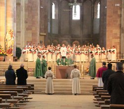 Bischof Wiesemann sprach in seiner Predigt auch über die Bedeutung der Liturgie. Zwar entfalten visionäre Orte wie es der Dom ist ihren Charakter schon allein beim Eintritt in ihren Raum, "aber wirklich lebendig wird er in der kultischen Feier, in der Gemeinschaft derer, die Gott in ihrer Mitte erfahren und die nicht nur einen fremden Bau betrachten, sondern sich selbst mitten darin wissen als lebendige Steine. Dann durchschallt, durchschwingt den Raum der Jubel der Erlösten, in den uns die wunderbare Musik in unserem Dom immer wieder mit hineinnimmt." Dies konnten die Besucherinnen und Besucher des Pontifikalamtes - unter ihnen auch Ehrengäste aus Politik, Stadt, Dombauverein und Europäischer Stiftung Kaiserdom - bei der Feier miterleben: Die Dommusik gestaltete die Messe eindrucksvoll mit Werken von Christopher Tambling, Anton Bruckner und mit Liedsätzen zum Gesangbuch "Gotteslob". Domkapellmeister Markus Melchiori und sein Stellvertreter Joachim Weller leiteten den Konzertchor des Mädchenchors, die jungen Erwachsenen der Domsingknaben sowie den Domchor. Domorganist Markus Eichenlaub musizierte an den beiden Domorgeln.
