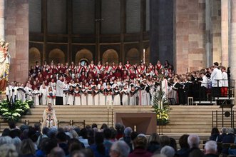 Zusammen mit dem einheimischen Mädchenchor am Dom und den Domsingknaben gestalteten die Gastchöre musikalisch eine Vesper am Samstagabend, der liturgisch Domdekan Christoph Kohl vorstand, und das Pontifikalamt mit Bischof Karl-Heinz Wiesemann am Sonntag im Dom. Der Domdekan ging mit der Redewendung „Davon kann ich ein Lied singen“ auf die jugendlichen Sängerinnen und Sänger ein und stellte das Loblied Mariens, das Magnificat, in den Mittelpunkt seiner Ansprache. Bischof Wiesemann griff die zweite Lesung des Sonntags, die Vision des Johannes auf „Ich sah einen neuen Himmel und eine neue Erde“. Er hob hervor, dass die jungen Menschen auch eine Vision haben und mit ihrem Singen anderen Menschen ein wahrhaftiges Zeugnis ihres Glaubens geben. Auch die Musik habe visionäre Kraft. Beim Singen stimme man gemeinschaftlich in etwas Größeres ein. Wenn man spüre, wie der ganze Chor einen einzigen Raum durchmessen und erfüllen könne, und dabei Menschen mitnimmt, dann geschehe etwas Besonderes: Ein Stück des himmlischen Jerusalem komme dann auf der Erde herab.