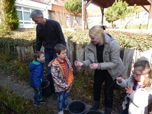 Zurück im Klassenraum konnten die Kleinen ihre Ausbeute in einen großen Holzkasten leeren, die Tierchen aus der feuchten Erde herausklauben und je nach Art vorübergehend in kleine Wohnungen (Behälter) unterbringen. Groß war die Begeisterung der Kinder über das lebendige Anschauungsmaterial, zu dem sie selbst beigesteuert hatten. Insbesondere auch am gläsernen Schaukasten, der zuvor mit diversen Erdschichten befüllt wurde und an dem sie nun zwei Wochen lang verfolgen können, wie tief sich die Würmer dort eingraben. Bevor die Kantine rief, gaben sie noch ordentlich Wasser drauf“, denn: „Die Würmer mögen’s feucht“, wissen die Schüler von ihrem Lehrer, dem „Herrn Meyer“. Der kann Kinder gut motivieren und über ihn sagen sie: „Der ist echt schlau!“. Eine andere Unterstufenklasse, der Gartentrupp, beschäftigte sich zeitgleich mit Erde, die in großen Kästen gemischt und in der Schubkarre an unterschiedliche Stellen gefahren wurde. Auf der Rückfahrt durften die Kinder abwechselnd selbst im Karren mitfahren, hellauf begeistert und quietschend vor Freude.