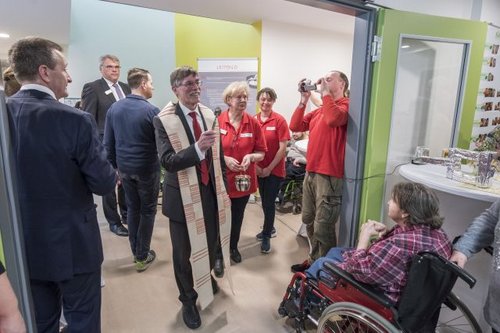 Lage und Größe der Einrichtung ermöglichten den Menschen mit Behinderung sehr weitgehende Teilhabe am gesellschaftlichen Leben. Die Einrichtung, die 18 Personen ein Zuhause bietet, sei so konzipiert und mit moderner Technik ausgestattet, dass Menschen trotz und mit ihrer Behinderung ein sehr hohes Maß an Selbstbestimmung und Selbstverwirklichung für sich umsetzen könnten, verwies Hoffmann auf ein Farbkonzept zur Orientierung und eine behindertengerechte Ausstattung, von der Nasszelle bis hin zur Kücheneinrichtung.