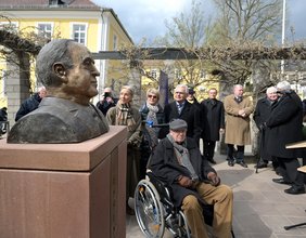 Wolf Spitzer (vorne) bei der Enthüllung der Portraitbüste Helmut Kohls am 03. April 2022 im südlichen Domgarten