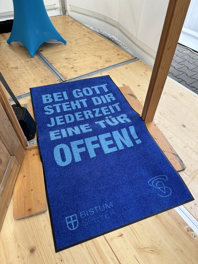 Mittelpunkt des Bistumsstands war dieses Jahr eine große offene Tür, durch die das Publikum durchlaufen konnte. Die Interessierten wurden dabei gefragt, wo sie bereits Gastfreundschaft erfahren würden, jedoch auch, für wen die Kirche gastfreundlicher sein soll. Einige Besucherinnen und Besucher berichteten von prägenden Erlebnissen in der Jugendarbeit, bei Taizé-Gebeten oder auf kirchlichen Festen wie eben dem Katholikentag. Hier empfänden sie Gastfreundschaft und die Stärke eines Miteinanders. Auf der Seite der verschlossenen Tür dagegen klebten Zettel, die verdeutlichten, dass die Kirche immer noch Menschen ausschließe: Randgruppen, Gläubige anderer Religionen, die queere Community oder auch Fragende und Gescheiterte.