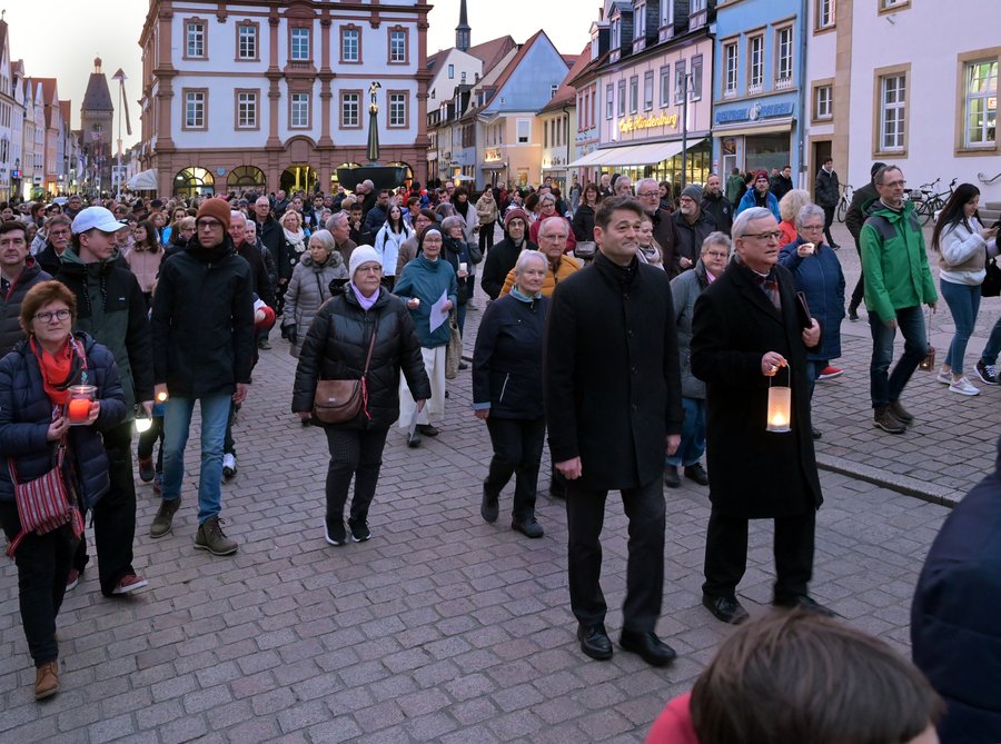 Vor dem Friedensgebet fand eine Lichterkette entlang der Speyerer Maximilianstraße statt, an der auch Bischof Wiesemann, Oberkirchenrat Jäckle und Mitglieder der Mennonitengemeinden Limburgerhof-Kohlhof und Friedelsheim teilnahmen. Zu der Lichterkette unter dem Motto „Gemeinsam gegen den Krieg“ ab 18 Uhr hatte das Bündnis für Demokratie und Zivilcourage Speyer aufgerufen.