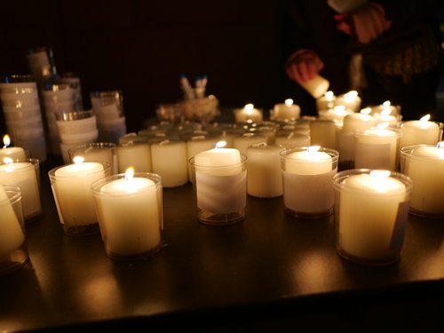 Kerzen, die beim Gedenktag 2022 im Gedenken an die Betroffenen von sexuellem Missbrauch in der Vorhalle des Doms entzündet wurden © Bistum Speyer