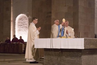 Zum Ende des Pontifikalamtes zum Jahresschuss wurde traditionell das Allerheiligste ausgesetzt und verehrt. In diesem Rahmen bat Karl-Heinz Wiesemann Gott um Beistand. Ein jubelndes "Te Deum" setzte den glanzvollen Schlusspunkt der Messe.