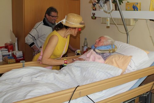 Die Clowndoktorin merkt, dass ihren Zuhörern die Musik gefällt und gibt für sie noch ein Ständchen. „Jetzt waren Sie kurz in der Oper und in Italien“, wendet sie sich an die Sänger und gibt mit der Frage „Waren Sie schon mal in Italien“ einer Bewohnerin Gelegenheit, der der aufmerksamen Dr. Schnuggelisch ein bisschen von sich zu erzählen. Mit einem „Dankeschön“ und „Haltet die Ohren steif“ verabschiedet sich die Clowndoktorin auf dieser Wohngruppe und geht in Begleitung von Arletta Groß vom Sozialdienst weiter auf ihrer Runde durch die Räume.