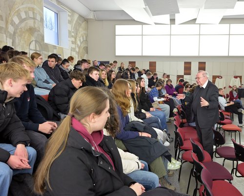 Den Tag beschloss ein einstündiges Gespräch mit einer Person, die in leitender Funktion Verantwortung für das Bistum trägt – In diesem Jahr waren das Bischof Dr. Karl-Heinz Wiesemann, Weihbischof Otto Georgens, Generalvikar Markus Magin und die Ordinariatsdirektorinnen Christine Lambrich und Dr. Irina Kreusch. In jedem dieser Gespräche ging es um konflikthafte Themen, die die Schülerinnen und Schüler bewegen. Die Frage nach der Rolle von Frauen in der Kirche war an jedem Begegnungstag dabei. Immer führte das Gespräch aber auch zu den Überzeugungen und den Erfahrungen, die einen lebenslangen Einsatz in der Kirche tragen. Die Rückmeldungen zeigten, wie sehr die jungen Menschen die Offenheit der Verantwortlichen schätzen.