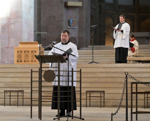 Speyer. Das Gedenken an das Leiden und Sterben Jesu stand im Mittelpunkt der Karfreitagsliturgie im Dom zu Speyer. Zelebrant und Prediger war Generalvikar Andreas Sturm. Der Gottesdienst wurde, wie auch die Messe zu Gründonnerstag, live auf den Social Media Plattformen von Dom und Bistum übertragen. Am Gründonnerstag hatte Weihbischof Otto Georgens die Messe zelebriert und gepredigt.