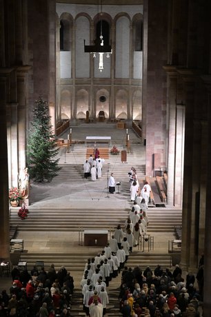 Speyer. Die Botschaft von Weihnachten kann man nach den Worten von Bischof Dr. Karl-Heinz Wiesemann „nicht nur nüchtern verkünden, man kann sie eigentlich nur singen – mit überfließendem Herzen.“ Es gebe „nichts Schöneres, als miteinzuschwingen in die himmlische Musik des Weihnachtsfestes“, indem man gemeinsam mit der Familie am Weihnachtstag die Lieder singt, „in denen das Wort von der Erlösung, von der grenzenlosen Liebe Gottes so tief aus dem Gemüt aufsteigen will“, sagte der Bischof in seiner Weihnachtspredigt (25.12.) im Dom zu Speyer. In seiner Begrüßung ging es Bischof Wiesemann um den Wunsch nach Versöhnung auf der Welt. Besonders sprach er sein Mitgefühl für all jene aus, die das Weihnachtsfest nicht in Frieden feiern können.