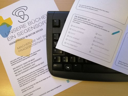 In Zeiten von Corona können die Büchereien leider keine „Ortstermine“ organisieren, um mit ihren Nutzern ins Gespräch zu kommen. Daher bietet es sich an, mit einer kurzen anonymen Umfrage eine Möglichkeit zu schaffen, um viele Menschen unkompliziert am Visionsprozess und der Suche nach Segensorten beteiligen zu können. Ein kleines Plakat macht auf die Aktion aufmerksam, ein übersichtlicher Bogen stellt die vier Fragen vor: Was bedeutet Segen für mich? Warum ist die Bücherei ein Segensort? Was macht Segensort aus? Welche Segensorte wünschen Sie sich? - Das ansprechende Layout, das von der Geschäftsstelle Segensorte gestaltet wurde, lädt zum schnellen Beantworten ein, lässt aber auch Raum für eigene Erfahrungen, Wünsche und Anregungen, wie die Kirche im Bistum Speyer noch mehr zum Segen werden kann.