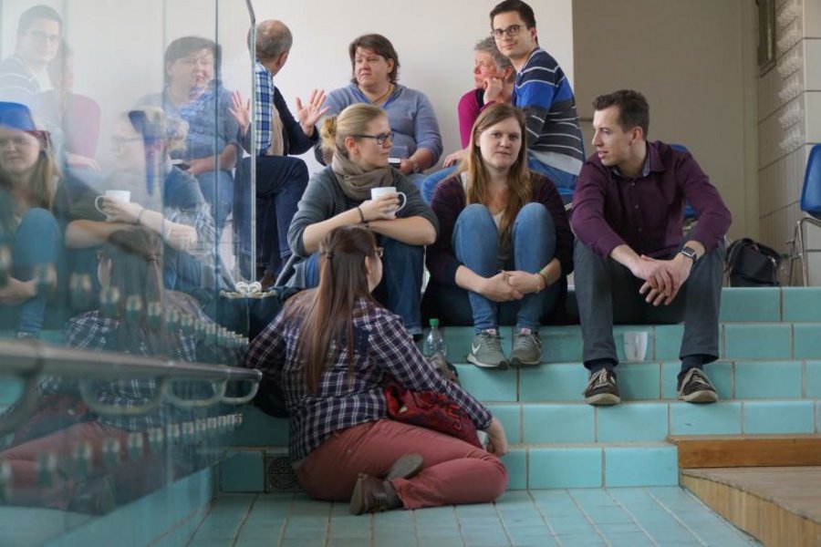 Ludwigshafen. Eine ungewohnte Kulisse für Kirche: Rund 90 Menschen saßen dicht gedrängt auf dem Grund des zum Podium umfunktionierten alten Schwimmbeckens im Start-Up- und Innovationszentrum „Freischwimmer“ in Ludwigshafen und diskutierten neue Ideen für ihre Gemeinden. Zwischen blau-türkisen Schwimmbadkacheln und Liegestühlen fand hier das erste Come-and-Go-Seminar des Bistums Speyer und der evangelischen Kirche der Pfalz statt. Von Freitag, 5. April bis Sonntag 7. April standen Inputs, Workshops, Vernetzung im Zentrum. Es kamen Haupt- und Ehrenamtliche, Katholiken und Protestanten, junge und ältere Interessierte. Was sie verbindet ist ein Interesse an Kirche und der Wunsch, diese in neuen Formen mit Menschen zu gestalten, zu denen Kirche bislang keinen Kontakt hat. Während manche Teilnehmer von Freitag bis Sonntag dabei waren, nutzten andere das Angebot, nur bestimmte Themenblöcke zu besuchen.