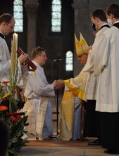 „Das Bild des Priesters hat sich in den vergangenen Jahren sehr gewandelt“, betonte Bischof Wiesemann in seiner Predigt. „Wir sind schon lange nicht mehr ‚Hochwürden‘. Und wir sind froh, dass wir das nicht mehr sein müssen.“ Die Aufgabe des Priesters sei ein „doppeltes Knien“: das „Niederknien vor Jesus Christus und der Versuch, ihn immer tiefer zu erfassen“, und zugleich ein „sich Beugen im Dienst an den Menschen“. Um das Bild Christi in der Welt zum Leuchten zu bringen - „farbenfroh, unmittelbar, menschlich nah und göttlich“ - müsse der Priester das Bild Jesu zutiefst in sich tragen. Nicht nur das Priesterbild, auch die Rolle der Kirche habe sich in den vergangenen Jahren verändert. „Wir können die Gesellschaft nicht mehr normieren. Auch das ist gut so, denn das Evangelium wollte schon immer etwas anderes: Menschen berühren, sie bewegen, Kräfte der Liebe und des Vertrauens in ihrem Leben freisetzen“. Kirche müsse heute hinausgehen und sich aussetzen. „Wir sind gesandt, die Botschaft Jesu dorthin zu tragen, wo sich das Leben der Menschen abspielt“, so Wiesemann.