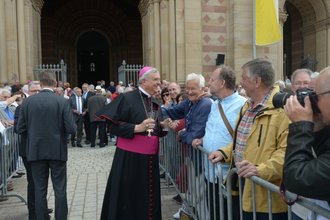 Nach dem Schlusssegen dauerte es dann noch gut eine halbe Stunde, bis die Ehrengäste aus der Vorhalle des Domes heraustraten und Bischof Wiesemann von hier den Weinausschank aus dem Domnapf eröffnete. Zunächst hatte Weihbischof Otto Georgens sehr zur Freude der versammelten Menge in Reimform Wein, Domnapf und Bistum besungen: „Um den Durst zu stillen, wär ab und an der Domnapf zu füllen“. Gründe dafür, so hieß es in Georgens Gedicht, „gibt es vielerlei, auch ein Papstbesuch war mit dabei“. Georgens, der seine in Speyer bekannte Bezeichnung als „Woibischof“ erwähnte, hatte zum Bistumsjubiläum, wie er sagte, „die Ehren, nun mit Euch den Napf zu leeren“. Der Weihbischof, der als Dompropst für den Dom Verantwortung trägt, berichtete ebenfalls in Reimform aus der Geschichte des Domnapfs, der erstmals im 14. Jahrhundert erwähnt wird. Die große Steinschale, die zum Bistumsjubiläum 1400 Liter Riesling der Weingüter Liedy, Frankweiler, und Schäfer, Mußbach, füllt, war ehedem ein Grenzzeichen: Wer sich hinter den Napf flüchtete, erhielt vor der staatlichen Gewalt sozusagen Kirchenasyl.
