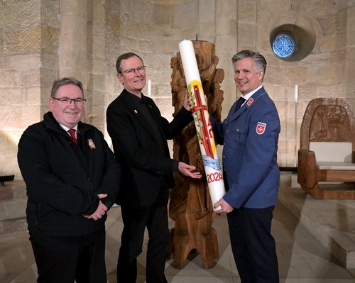 Domsakristan Markus Belz, Prof. Dr. Christopher Wolf, Diözesanleiter des Malteser Hilfsdienstes im Bistum Speyer, und Domdekan und Domkustos Dr. Christoph Kohl bei der Übergabe der Osterkerze 2024 im Speyerer Dom © Domkapitel Speyer, Klaus Landry