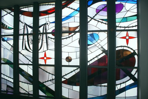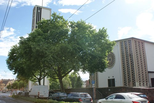 Beim Wiederaufbau erhielt die Kirche einen freistehenden, 42 Meter hohen Glockenturm, in dem mit drei Tonnen übrigens die größte Kirchenglocke der Stadt läutet. Der Kreuzweg der Kirche ist in großflächigen Fenstern mit Bleiverglasung zu finden. Er erinnert an das frühere Kriegsgefangenenlager in Rheingönheim.