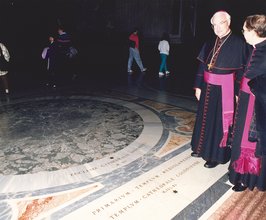 „Ecclesia Cathedralis Spirensis M 134“ dieser Schriftzug wurde vor 30 Jahren im Fußboden des Petersdoms eingelassen. Damit wurde der Dom als eine der längsten Kirchen der Welt im Marmorboden von St. Peter verewigt. Die Idee, den Dom hier einzureihen, hatte Prof. Dr. Peter Eichhorn bereits 1985 dem damaligen Domdekan Bruno Thiebes vorgetragen. Nach Beratungen von Domkapitel und Bischof wurde man dann in Rom vorstellig, wo der Botschaftsrat in der Botschaft der Bundesrepublik Deutschland beim Heiligen Stuhl, Prälat Alois Heck, ein Priester aus der Diözese, das Anliegen beförderte. Im September 1989 wurde diesem Anliegen dann entsprochen. Wenig später nahm Diözesanbischof Anton Schlembach den Schriftzug dann vor Ort in Augenschein.