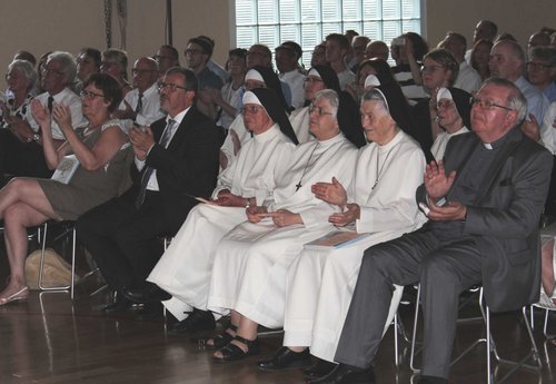 Ebenso positiv äußerte sich Monika Kabs, ebenfalls frühere Schülerin und heute als Bürgermeisterin in Speyer unter anderem für Schulen verantwortlich. Auch sie habe früher die Schule als einen „Ort, wo man Achtung und Respekt lernen konnte“, kennengelernt. Die Stadt sei dankbar für die vier Privatschulen in Trägerschaft der Gemeinnützigen St. Dominikus Schulen GmbH und betrachte sie als wertvolle Ergänzung, denn die kirchlichen Träger würden „Tradition und Fortschritt verbinden“. Die Schülerinnen des ESG, lobte Kabs, gehörten zu den ersten und engagiertesten Unterstützerinnen in der Flüchtlingsarbeit in Speyer, die Schule sei ein verlässlicher und engagierter Partner in der Erinnerungsarbeit und zeige großes Interesse an Patenschaften. „Edith Stein wäre zu Recht stolz auf Sie!“, schloss die Bürgermeisterin ihre Ansprache.