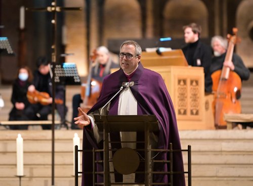 In seiner Begrüßung nahm der Generalvikar des Bistums Speyer den Titel des Choralvorspiels BWV 641 von Johann Sebastian Bach auf, das zu Beginn des Gottesdienstes erklang: „Wenn wir in höchsten Nöten sein“ sei das passende Stück für diese Andacht. Sturm blickte dabei auf alle Menschen, die derzeit unter der Pandemie leiden, jedoch auch auf die, welche einen „Menschen gehen lassen mussten, ohne ihn dabei begleiten zu können“.