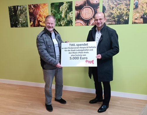 Ludwigshafen. Ein glückliches Strahlen breitete sich im Gesicht von Ansgar Schreiner, 2. Vorsitzender des Fördervereins Hospiz & Palliativ, aus, als ihm Dieter Feid, kaufmännischer Vorstand von TWL, den Scheck in Höhe von 5.000 Euro überreichte. Denn: Die Höhe der Gelder blieb für die Begünstigten bis zur Übergabe eine Überraschung. „Mit einer Spende in dieser Größenordnung können wir vieles bewirken – sei es im hospizlichen Bereich, auf der Palliativstation oder durch die Unterstützung ehrenamtlicher Trauerbegleiter. Wir sind TWL sehr dankbar“, betonte Ansgar Schreiner.