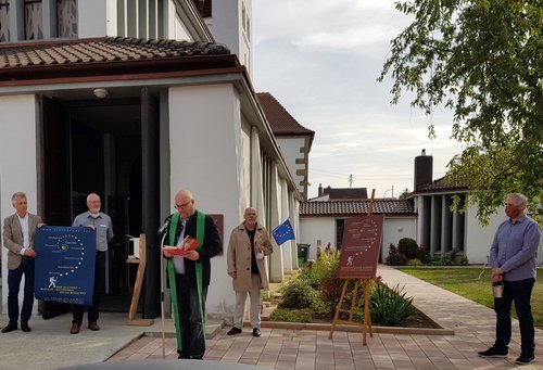 Die feierliche Einweihung des Wegzeichens und Informationsschildes erfolgte durch Pfarrer Bernhard Braun nach einem Gottesdienst im Beisein von Ortsbürgermeister Stefan Stähly, Karl Unold (St. Jakobus-Gesellschaft Rheinland-Pfalz-Saarland e.V.) sowie Gerhard Frübis, der sich vor Ort als „Pate“ und Botschafter der Vision des europäischen Modellprojektes mit großem Engagement engagiert hat. Anwesend war auch Projektleiter Peter Michael Lupp vom Regionalverband Saarbrücken, der das Projekt in einem Bildvortrag vorstellte.