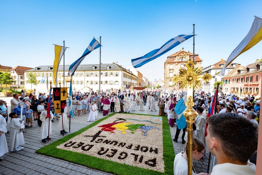 Speyer. Mit mehreren hundert Menschen feierte Bischof Dr. Karl-Heinz Wiesemann mit allen Gemeinden der Dompfarrei Pax Christi in Speyer das Fronleichnamsfest. Die Feier, die unter dem Leitwort des Heiligen Jahres „Pilger der Hoffnung“ stand, begann mit einem festlichen Gottesdienst in der Kirche St. Joseph, an dem auch Vertreter des Domkapitels sowie Seelsorger der Pfarrei teilnahmen.