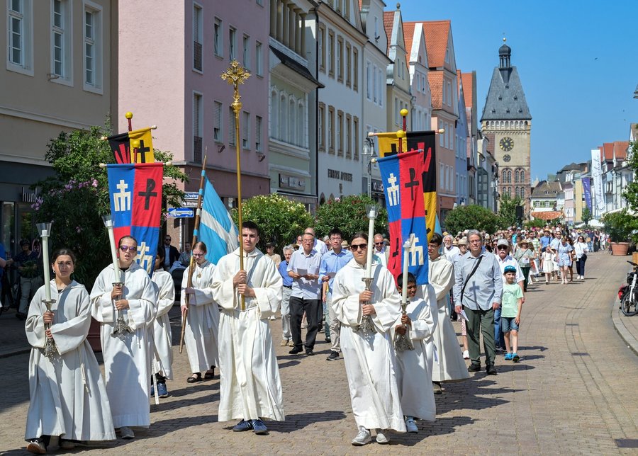 Im Anschluss zogen die Gläubigen in einer Prozession durch die Gilgen- und Maximilianstraße bis vor den Dom, wo die Feier mit einer Statio mit Gebeten, Liedern, von den Kommunionkindern vorgetragenen Fürbitten und dem sakramentalen Segen ihren Abschluss fand. Im Anschluss waren alle Mitfeiernden zur Reunion im Hof des Klosters St. Magdalena eingeladen.