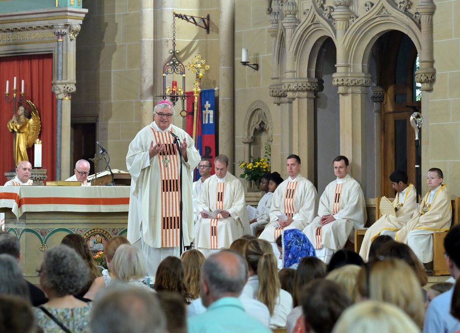 Und in der neutestamentarischen Geschichte der wundersamen Brotvermehrung zeige, wie schnell Handeln missverstanden werden könne. Nachdem Jesus die fünftausend Menschen ernährt, wollen sie ihn zum König machen, „damit sie alle immer gut versorgt sind und alles in Ordnung ist“, erläuterte Bischof Wiesemann den Text aus dem 6. Kapitel des Johannes-Evangeliums. Jesus fühlte sich dadurch zutiefst missverstanden und erklärte den Menschen, er selbst sei das Brot und gebe sein Leben, seine Freiheit für die Menschen hin. „Wenn wir diese Erkenntnis mit allen teilen, gehen wir als Pilger der Hoffnung durch diese Welt“, schloss Bischof Wiesemann seine Predigt.