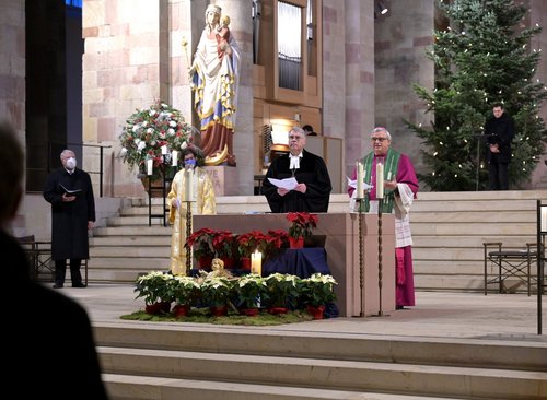 „Der Gebetswoche für die Einheit liegt eine tiefe Sehnsucht zugrunde: Die Sehnsucht, alles zu überwinden, was unsere Kirchen noch trennt, und immer mehr zusammenzuwachsen“, sagte Bischof Karl-Heinz Wiesemann in seiner Begrüßung. Er verwies darauf, dass in diesem Jahr Schwestern der Kommunität von Grandchamp die Texte der Gebetswoche erstellt haben und sich die Struktur des Gottesdienstes an dem dreigeteilten Abendgottesdienst, den die monastische Gemeinschaft in der französischen Schweiz jeden Tag feiere, orientiere. Es könne wohltuend sein in einer Zeit, die durch die gravierenden Auswirkungen der Corona-Pandemie geprägt sei, „in den Jahrhunderte alten Strom der monastischen Gebetstradition“ mit einem Wechsel von Gebet und Stille einzutreten. „Lassen wir uns tragen von diesem Gebetsstrom. Lassen wir uns von ihm verbinden – mit Gott und untereinander“, so Bischof Wiesemann.