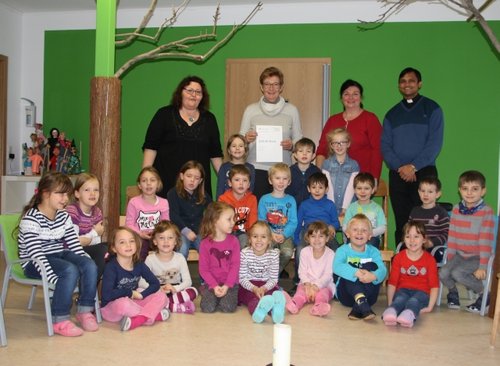 Kinder der Kita mit (letzte Reihe von links(: Michaela Nenninger (Leiterin der Kita), Renate Gerlich (Leiterin Nardinihaus Pirmasens), Christa Kästel (Erzieherin in der Kita St. Josef), Pater Naveen Pudota (Kaplan der Pfarrei Heilig Geist).