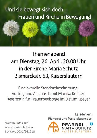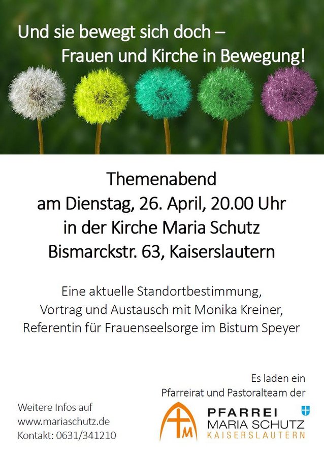 Kaiserslautern. Auf Initiative des Pfarreirats lädt die Pfarrei Maria Schutz in Kaiserslautern zu einem ersten Themenabend am Dienstag, 26. April, um 20 Uhr in der Kirche Maria Schutz (Bismarckstr. 63, 67655 KL) ein. Das Thema des Abends lautet: "Und sie bewegt sich doch - Kirche und Frauen in Veränderung!" - Eine Standortbestimmung. Den Vortrag hält Monika Kreiner, Referentin für Frauenseelsorge im Bistum Speyer.