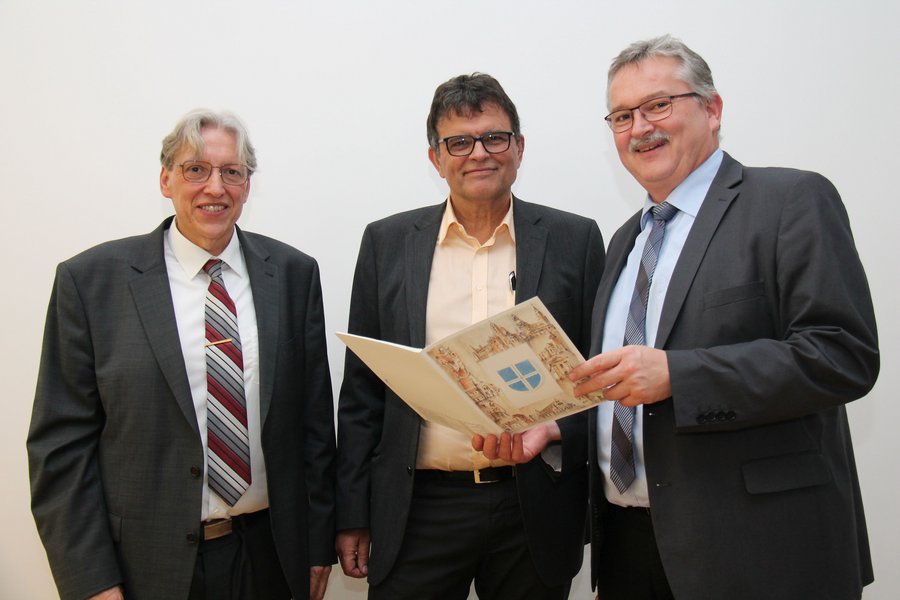 Joachim Vatter (links), Heinz-Peter Schneider (Mitte) und Wolfgang Jochim mit der Dankurkunde des Bistums.