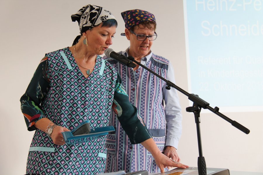 Zu Beginn der Feier hatten Prisca Forthofer und Uschi Wendel vom SpeQM-Projektteam als „Putzfrauen zur Vorbereitung einer SpeQM-Veranstaltung“ einen gelungenen humorvollen Einblick in den Qualitätsmanagement-Prozess und ein dafür aufgelegtes „Dädsch mer mol – Handbuch“ gegeben.