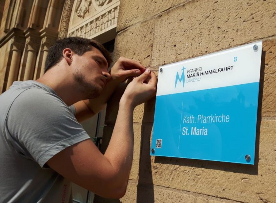Landau. Alle kirchlichen Gebäude der Pfarrei Mariä Himmelfahrt Landau erhielten mitten in den Sommerferien eine einheitliche Beschilderung. Sie sind mit dem Logo der Pfarrei, der Bezeichnung des Gebäudes und einem QR-Code versehen.