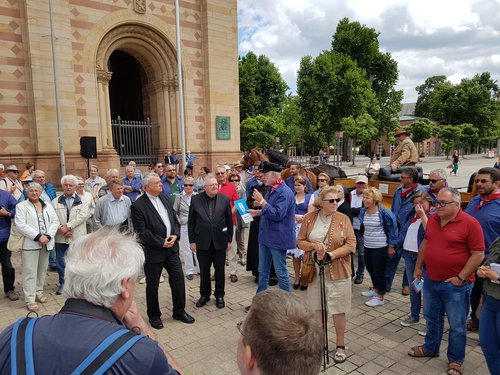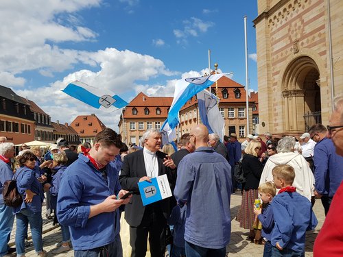 Speyer. „Wo isses Trinke? Wir ham dorscht!“. Georgius, Verwalter des „göttlichen Weinkellers“, und Maria begrüßten humorvoll das Publikum auf dem Domplatz, während beide im Domnapf standen. Sie erzählten in Form eines Schauspiels von der nicht immer einfachen Aufgabe, den Weinzehnten zu erbringen. Im Anschluss hob der Kirrweiler Bürgermeister Rolf Metzger augenzwinkernd die engen historischen Beziehungen zwischen Speyer und Kirrweiler hervor. Seit der Zeit der Fürstbischöfe könne sich „die Qualität des abgelieferten Produktes sehen lassen“. Und so knüpfte er an den mitgebrachten Wein auch die Bedingung, dass Bischof Wiesemann nun im Gegenzug in Kirrweiler eine Messe abhalten müsse. Neben seinem ausdrücklichen Dank an alle Beteiligten, sagte Bischof Wiesemann zu, die geforderte Messe abzuhalten, allerdings „immer auch mit dem Gegenversprechen, dass dann alle da sind!".